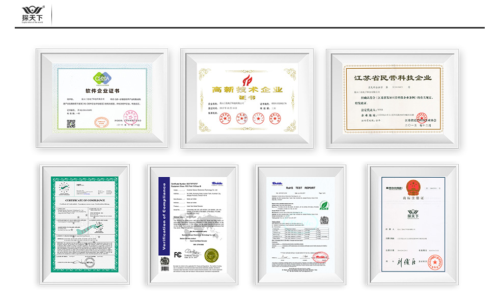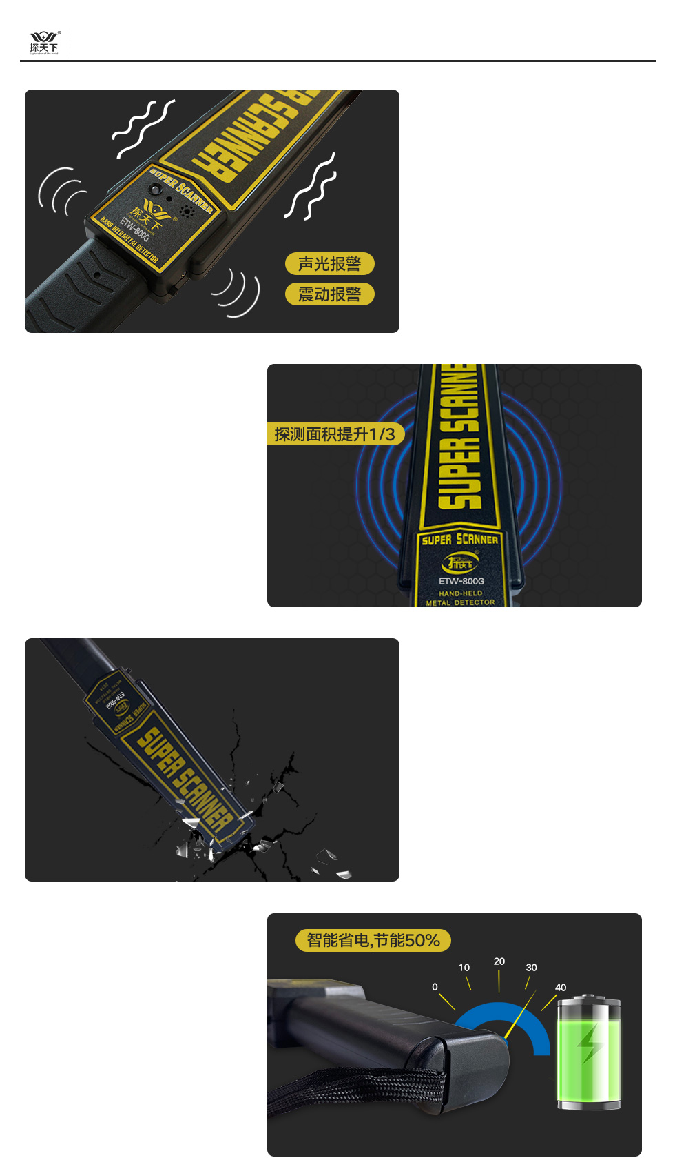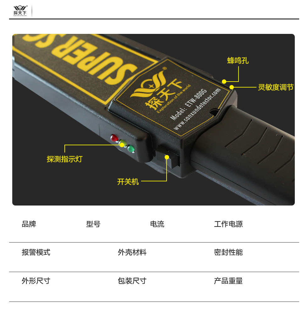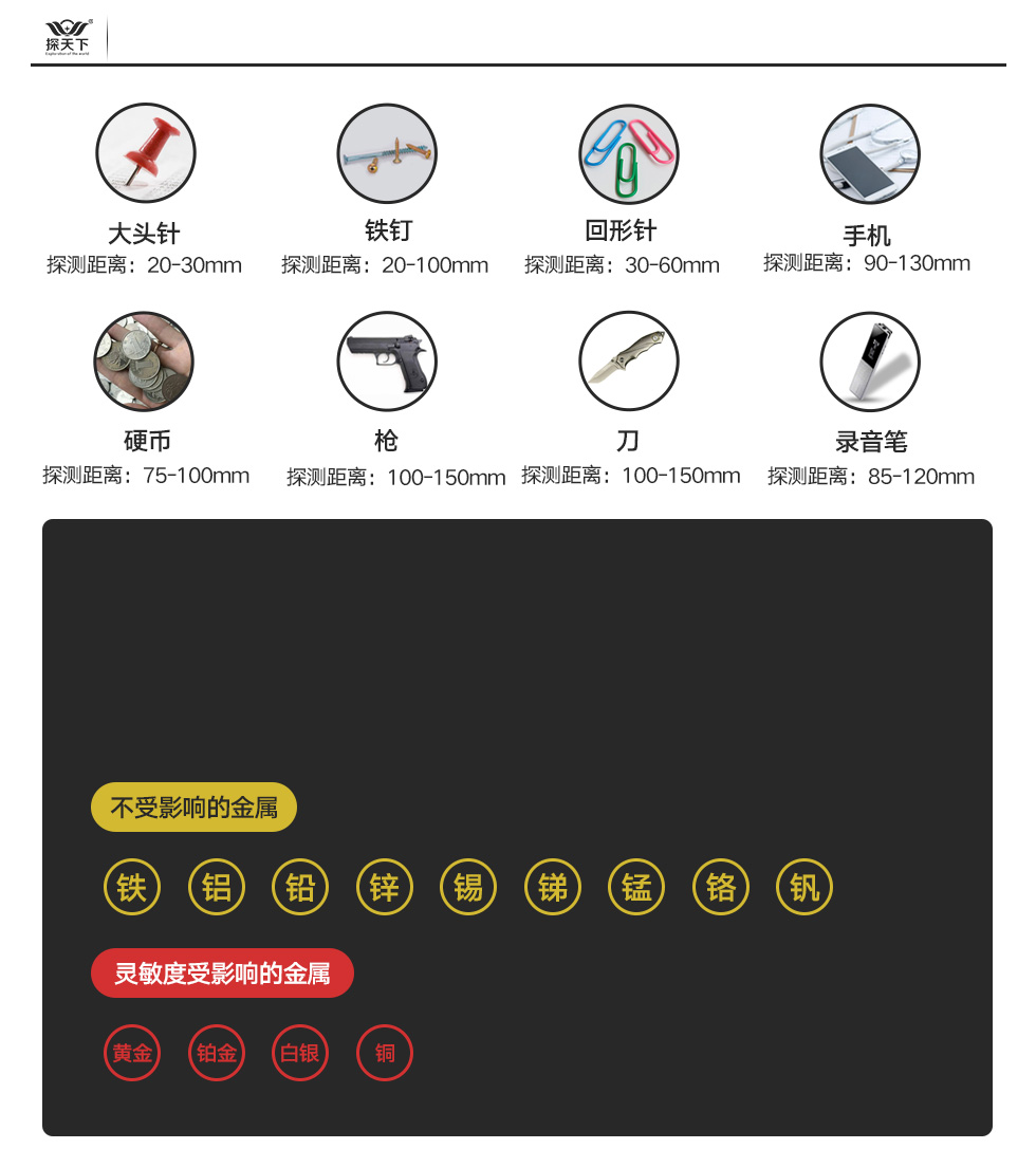 手持高灵敏度探测仪 产品优势 双重报警模式 操作简单快捷 两种报警模式可选 可适用不同场所 0.4S快速响应 内置新无氧铜感应线圈 在感应范围内检测到金属物质 立即发起报警 抗震耐摔 加厚工程塑料 人性化细节处理 提高产品使用寿命 功耗低、续航时间长 采用智能节电技术 正常工作下约3个月左右 做到真正的低能耗、高续航 规格参数 探天下 ETW-800G <50mA 单节9V电池(另配) 声(震)光同步报警 黑色ABS IP64 (mm)413×82×42 (mm)445×265×520 0.5kg/只 资质证书 常见金属距离测试 手持金属探测器可满足日常大件金属探测使用,如需用于木材探钉,限埋藏深度 0-10mm,且视乎探测器灵敏度高低结合钉子大小而定。 针对产品技术特性,目前已知对黄金、铂金、白银、铜材、钛等体积较小的金属 物,例如重量较轻的项链、多芯铜线等探测灵敏度将受到影响而下降。 产品推荐 |